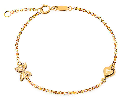 Gyermek karkötő 9 karátos sárga aranyból. A karkötő egy szív alakú medálból és egy finoman gravírozott négylevelű lóheréből áll. A karkötő hossza 140-160 mm tartományban változtatható. A rögzítés része egy hosszabbító, amivel szabályozható a karkötő hossza.