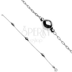 925-ös ezüstből készült karkötő, kis téglalap alakú láncszemekből. A láncra három tojás alakú, fényes ezüst gyöngy van fűzve. A gyöngyök mozgását kis golyócskák akadályozzák, mindkét oldalról. Delfinkapocs zárás. A karkötő hossza: 190 mmA karkötő súlya: 2,6 gFémjelzéssel ellátott.