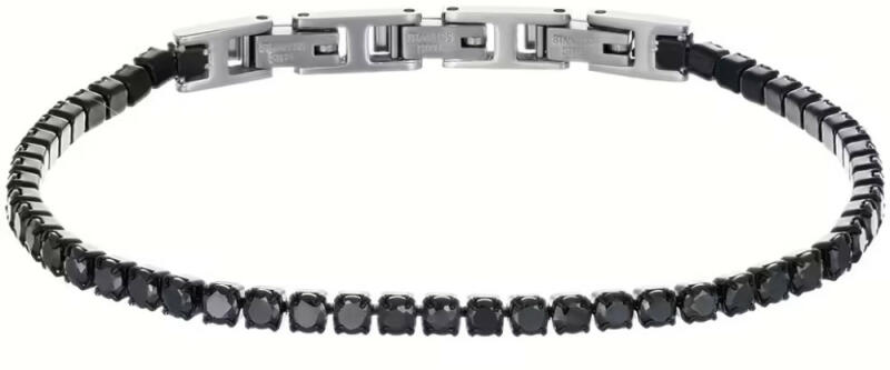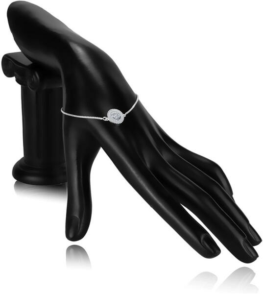 A 925 ezüstből készült karkötő Venezia mintás láncból van kialakítva, amely sűrűn egymáshoz kapcsolódó kis négyzet alakú láncszemekből áll. A díszítő részen egy dupla kör található, amelyet sűrűn beágyazott apró átlátszó kerek cirkóniák díszítenek. A gyűrű középső része egy merészebb, szimmetrikus, domború szív alakúra vágott átlátszó cirkóniáb
