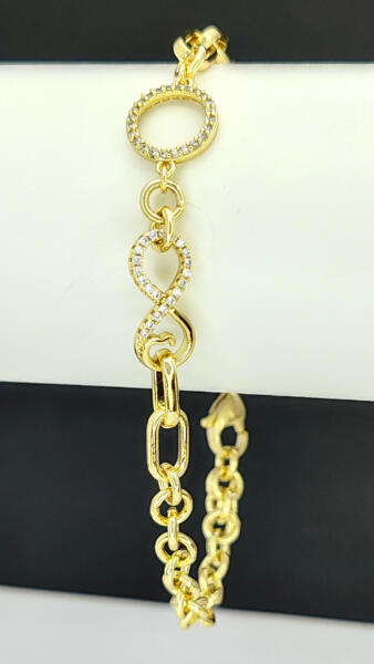 Aranysárga színű karkötő, melyet végtelen jelet formázó szem díszít és fehér cirkónia kristályok tesznek csillogóvá. A kristályok karmos foglalatban helyezkednek el. A kristályok a karkötő első harmadát díszítik. Időtálló ékszer, nem feketedik, nem színezi a bőrt ("gold filled"). Mindennapi használatra is tökéletes választás. Antiallergén ékszer. 14K arany szí