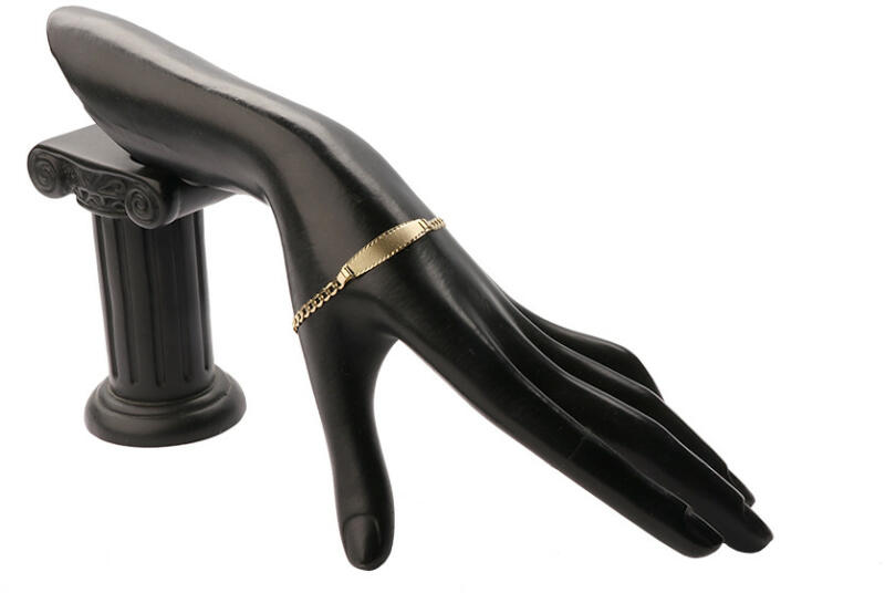 18K sárga aranyból készült karkötő, szatén felületű téglalap alakú lemezzel díszítve, a szélén átlós peremezéssel. A lemez felfelé enyhén domború, és a végén fokozatosan keskenyedik. Rugós gyűrűzárral záródik. Karkötő szélessége: 3,5 mm A lemez méretei: 30 x 7 mm A zár szélessége: 4 mm Szíj hossza: 160 mm (+/- 5%) Karkötő súlya: 1.9 g Fémjel - van.