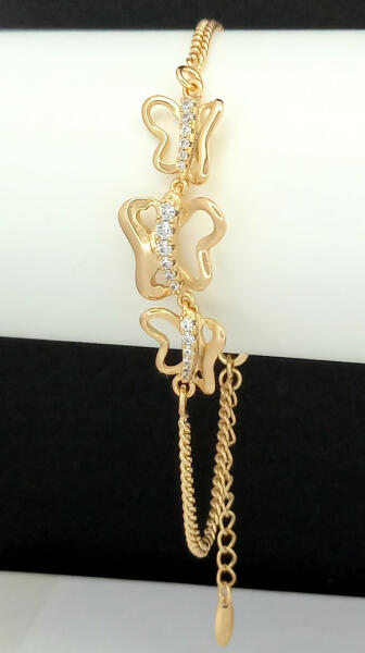Aranyszínű vékony karkötő, melyet három pillangó medál díszít és fehér cirkónia kristályok tesznek csillogóvá. A kristályok karmos foglalatban helyezkednek el. Időtálló ékszer, nem feketedik, nem színezi a bőrt ("gold filled"). Mindennapi használatra is tökéletes választás. Antiallergén ékszer. 18K arany színben kapható. Karkötő szélessége: 2 mm. Pillangó medá