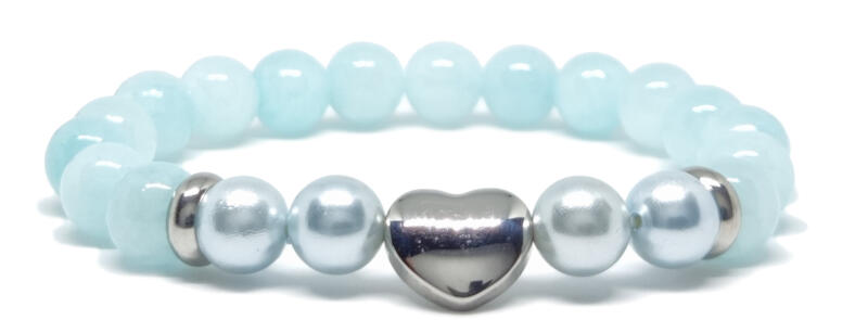 Kiváló minőségű valódi jáde égkék ásványból készült ásvány karkötő. Az égkék jade karkötő tiszta, élénk árnyalata és elegáns megjelenése figyelemfelkeltő kiegészítő, miközben a frissesség és az új lehetőségek szimbólumaként viselhető. A karkötő valódi, jáde égkék, shell pearl (világoskék) 8-9 mm ásványból nemesacél köztes és szív dísszel ké