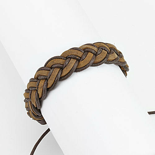 A bőrkarkötő vastag, világosbarna színű bőr sávokból áll, amelyek sötétbarna csíkokkal vannak összefonva. A karkötő rögzítésének hosszúsága állítható. Szélesség: 15 mmHossz: 180 mm (+/- 5%)A hosszabbító zsinór hossza: 80 mmAz ár egy darabra vonatkozik.