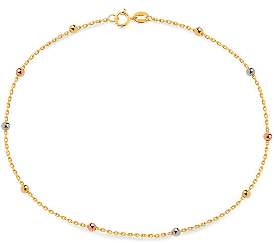 Legyen divatos egy stílusos láblánccal, amely megfelelő csillogást kölcsönöz ruhájának. Az egyszerű láncot három színben csillogó golyók díszítik. Nekik köszönhetően kiemelkedik a magasfényű sárga arany szépsége. A tollgyűrűn való rögzítés biztosítja a biztonságos viselést. Válassza ki a lánc hosszát a rendelkezésre álló méretek közül.