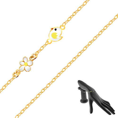 A 9K sárga aranyból készült karkötő, medálokkal. Fehér mázzal és sárga szárnnyal ellátott csibe és fehér mázzal ellátott virág alakú, fix medálok díszítik. A virág csőrét, szárnyát és szirmait formázó vonalak fényesek és simák. A medálok elválaszthatatlanok a lánctól. A láncot alkotó ovális láncszemek merőlegesen kapcsolódnak egymáshoz. A karkötő áll