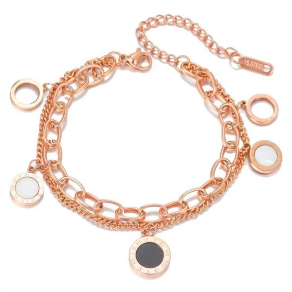 Luna Karkötő Csodszép Luna karkötő verhetetlen áron. A karkötő dupla soros, kör alakú medálok díszítik. Kialakítását Ön is biztosan megkedveli. Az ékszer nem tartalmaz nikkelt, ezért érzékeny bőrű emberek is viselhetik. Tulajdonságok: A karkötő hossza: 16cm + 4cm Anyaga: Nemesacél Szín: RózsaArany
