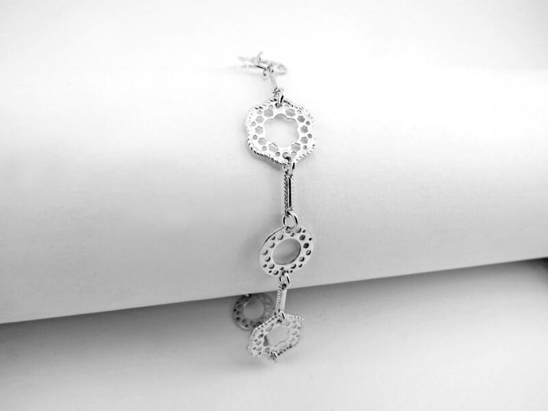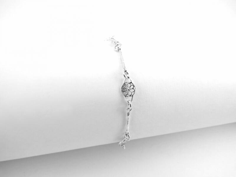 Aranyos és elegáns ez az apró virágokkal díszített filigrán kis ezüst karkötő. Egyszerre vagány és nőies volta miatt bátran ajánljuk minden olyan nőnek, hölgynek és leányzónak, aki szeret odafigyelni az apró részletekre és jól érzi magát a bőrében. :)