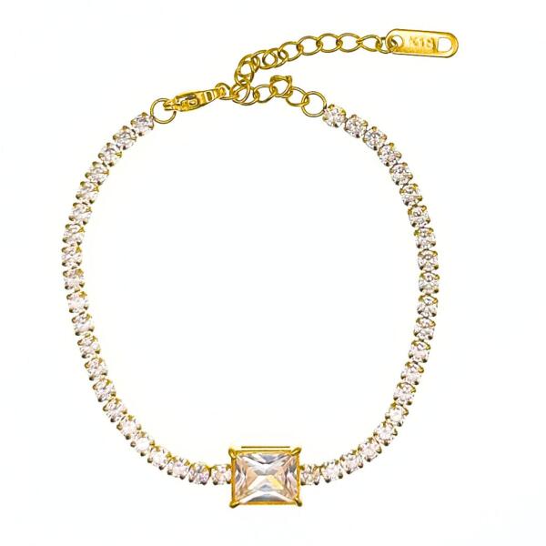 Tündökölj ezzel a kifinomult orvosi acél karkötővel, amely 18k arany bevonatával és ragyogó cirkónia köveivel garantáltan vonzza a tekinteteket. A lánc finoman csillogó, kisebb cirkónia kövekkel van díszítve, míg középen egy nagyobb méretű cirkónia kő koronázza meg az ékszer szépségét. Ez a karkötő tökéletes választás, hogy elegáns és modern megjelenést kölc