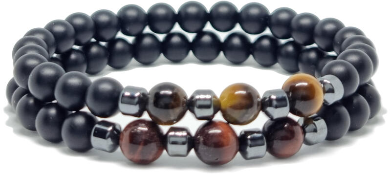 Kiváló minőségű valódi ónix matt ásványból készült páros ásvány karkötő. Az ónix karkötő mély fekete árnyalatával és erőteljes megjelenésével stílusos kiegészítő, amely magabiztosságot és stabilitá st sugall viselőjének. A karkötő valódi ónix matt, macskaszem, tigrisszem 6 mm ásványból és hematit dísszel készült. Az ásvány, karkötő formában visel