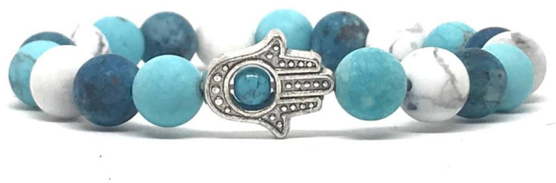 Egyedi ásvány karkötő Hamsa-védelmező kéz dísszel A 8mm-es Achát, Türkiz és Howlit ásvány golyókból készült karkötő speciális gumis damilra van fűzve, hamsa kéz díszítéssel. Amit az achátokról tudni kell: Az achát rengeteg színben fellelhető, többnyire szürke, kékesszürke, zöldesszürke, szürkésfehér, barna csíkos, áttetsző. Az achátok testi és lelki hat