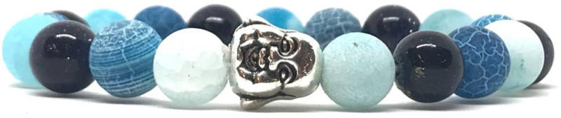 Egyedi ásvány karkötő Buddha fej köztes dísszel A 8mm-es kék Achát és Napkő ásvány golyókból készült karkötő speciális gumis damilra van fűzve, buddha fej díszítéssel. Amit az Achátokról tudni kell: Az achát rengeteg színben fellelhető, többnyire szürke, kékesszürke, zöldesszürke, szürkésfehér, barna csíkos, áttetsző. Az Achátok testi és lelki hatásai: Ti