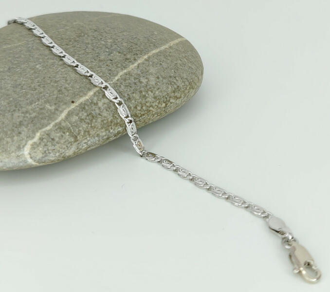 Ezüstszínű csigaszemes karkötő. Időtálló ékszer, nem feketedik, nem szinezi a bőrt ("gold filled"). Mindennapi használatra is tökéletes választás. Antiallergén ékszer. Karkötő szélessége: 2,5 mm. Karkötő hossza: 18,5 cm. Az antiallergén ékszerek olyan fémötvözetből készülnek, melyek nem irritálják a bőrt, nem okoznak allergiás reakciókat, ezért fémre érzéken