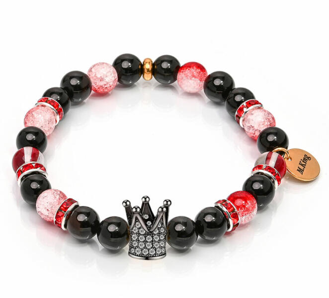 Különleges, kicsit démoni hangulatú csillogó-villogó kristály és ónix karkötő, a piros és a fekete vadító párosításával. A korona dísz gyönyörűen kidolgozott, még tovább emeli a karkötő fényét. Figyelem! A képen exkluzív kivitelű, rugalmas karkötő látható kapocs nélkül, de kérheted extra erős acélsodronyra is delfinkapoccsal és 5 cm hosszabbítólánccal. H