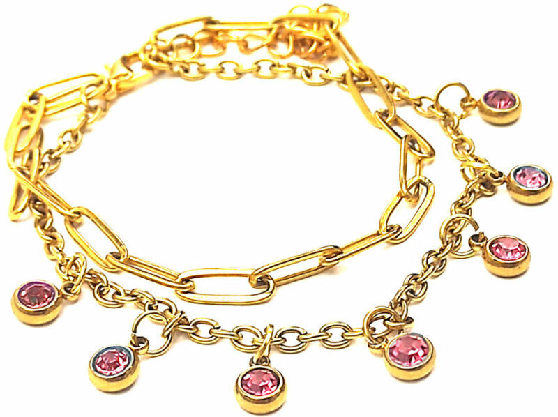 Pink kristályos charmos dupla karkötő, 7 charmmal. Paramé terek: Charm mérete 0,6 cm. Anyaga nemesacél, karkötő anyaga rozsdamentes acél. Karkötő mérete 17+5 cm. (Ha ettől eltérő méretet szeretnél, rendeléskor a MEGJEGYZÉSBE írd be. ) Szélesség 4 és 3 mm. Csajos, divatos, mégis vagány karkötő, nem túl sok, nem túl kevés, feltűnő, de nem hivalkodó.