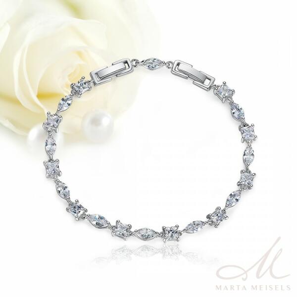 Klasszikus stílusú, finom kidolgozású menyasszonyi karkötő cirkónia kristályokkal és valódi fehérarany bevonattal díszítve. Állítható a mérete, 17cm és 19 cm hosszúság között. Finom, elegáns karkötő, melyet a klasszikus stílust kedvelő menyasszonyoknak ajánluk hófehér ruhához. Klasszikus, finom sítlusú ... Garantált minőségű karkötő ... Nikkelmentes, nem okoz