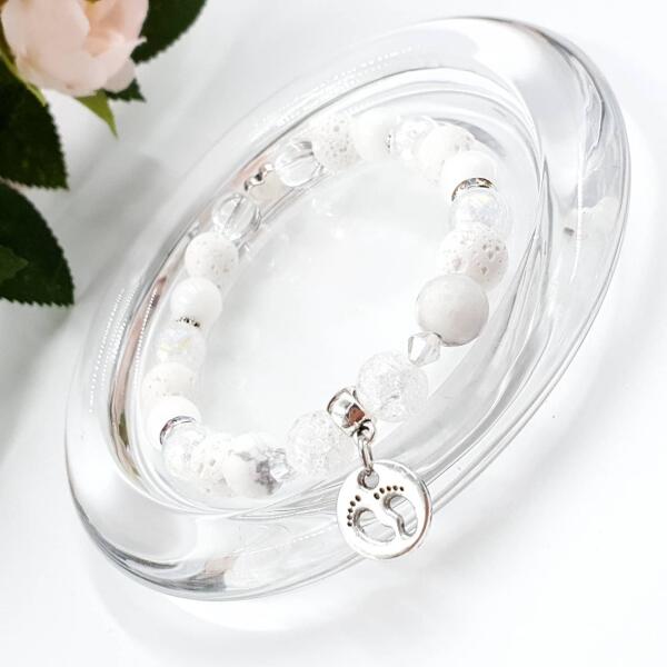 Gyönyörű csiszolt, 8 mm átmérőjű matt, áttetsző és roppantott hegyikristályból, illetve tejkvarc és fehér lávakő ásványokból készült karkötő, és egy 10 mm átmérőjű tappancs medál díszít.