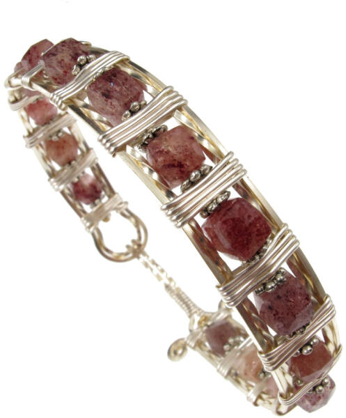 Különleges, rózsaszín hilulitból készítettem merev karkötőt. A karkötő anyaga ezüstözött réz, a hilulit 8mm-es fazettált felületű kocka. A karkötő felvételkor kisebb hajlítást tolerál, de az erőteljes szétfeszítés károsítja és törékennyé válhat. A karkötő biztonsági kapoccsal bekapcsolható. Belső kerülete 18,5-19cm. A kő szépsége, hogy enyhén áttetsző