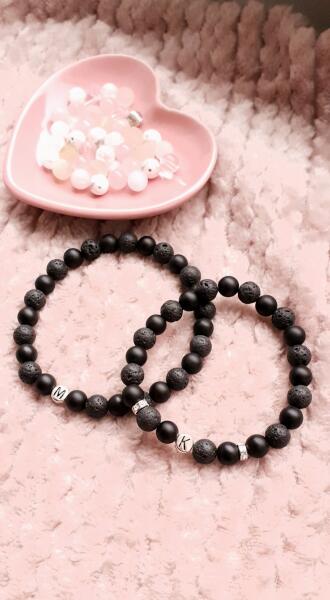 Gyönyörű lávakő-ónix szerelmi karkötőpár szabadon választható betűkkel. Az ár egy pár (2db) karkötőre vonatkozik.
