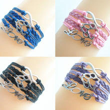 Ötszintes, színes fonott bőr karkötő kutyamániásoknak! :) Alul a "Love"felirat, középen egy fém tappancs, felül pedig a végtelen jele található!