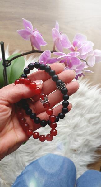 Gyönyörű egyedi szerelmi karkötőpár. A női karkötő pirosas bordó karneol ásványból készült és egy ezüst luxury korona medál díszíti, a férfi karkötő matt fekete ónix ásványból készült, és egy fekete luxury korona medál díszíti. ez a karkötőpár az összetartozást jelképezi. Az ár egy pár (2db) karkötőre vonatkozik.
