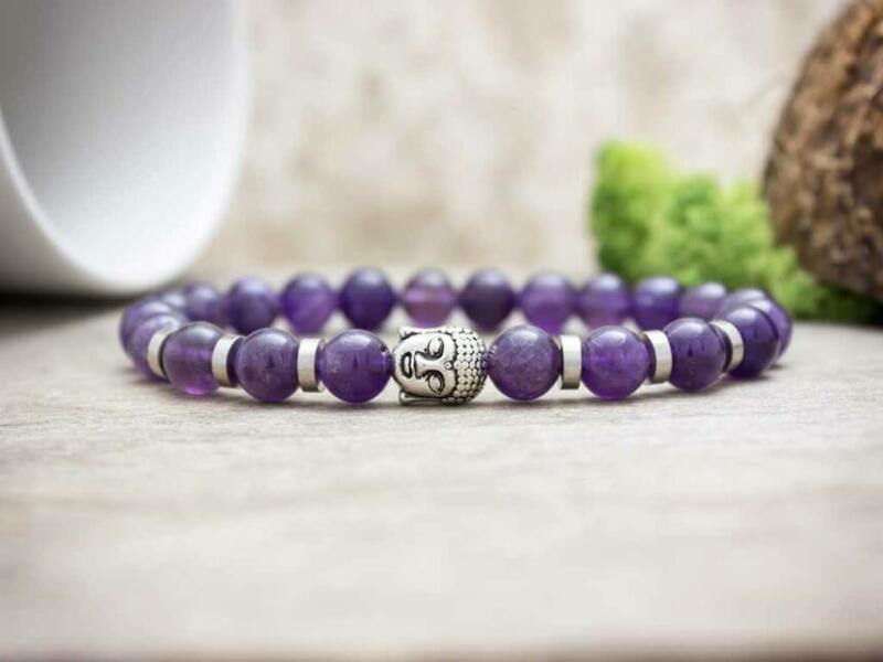 8 mm-es ametiszt ásvány gyöngyökből speciális gumira fűzött ezüst színű Buddha fejjel díszített karkötő. Amit az ametisztról érdemes tudnod: Az ametiszt a kvarccsoport legkedveltebb köve, az achát ásvány belső felszínén növekszik. Míg a kristály maga jó néhány centiméterre nő meg, az azt tartalmazó geóda akár több méter hosszú is lehet. Ennek a fenséges kőne