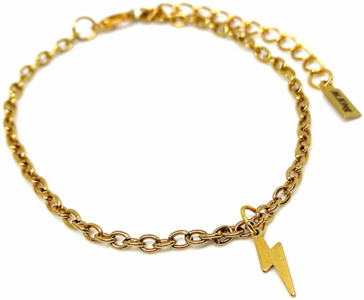 Arany színű karkötő nemesacél villám charmmal. Paraméterek:. Charm mérete kb. 1 cm. Charm anyaga nemesacél. Karkötő mérete 17+5 cm. (Ha ettől eltérő méretet szeretnél, rendeléskor a MEGJEGYZÉSBE írd be. ) Karkötő anyaga rozsdamentes acél.