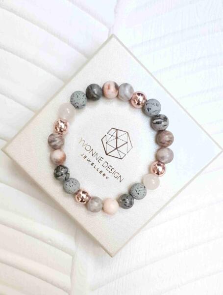 Ez a karkötő egyedi tervezésű, mely zebra jáspis, rose zebra jáspis, szürke lávakő, és rózsakvarc ásványokból készült rosegold gyöngy díszítéssel.