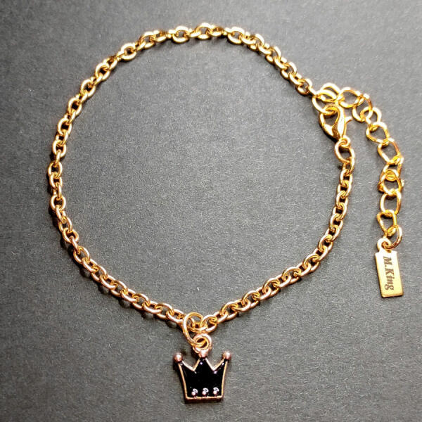 Fekete tűzzománc korona charmos arany színű karkötő. Paraméterek: Charm mérete 1,2 cm. Anyaga fémötvözet, karkötő anyaga rozsdamentes acél. Karkötő mérete 17+5 cm. (Ha ettől eltérő méretet szeretnél, rendeléskor a MEGJEGYZÉSBE írd be. )