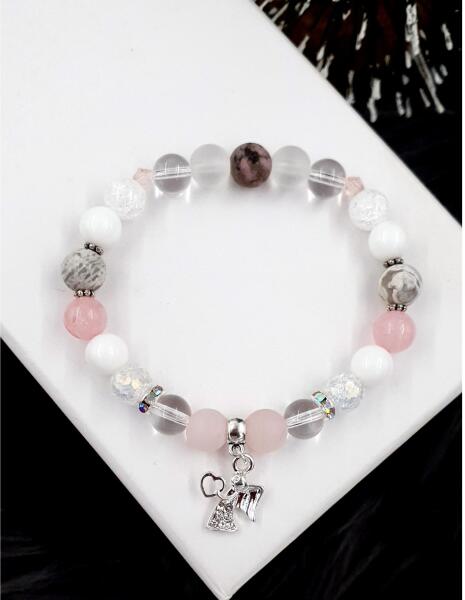 Szívecskés angyal kristálykarkötőHegyikristály, matt hegyikristály, tejkvarc, matt rózsakvac, jáspis ásványokból készült karkötő, mikro kristályos angyalka medállal díszítve.