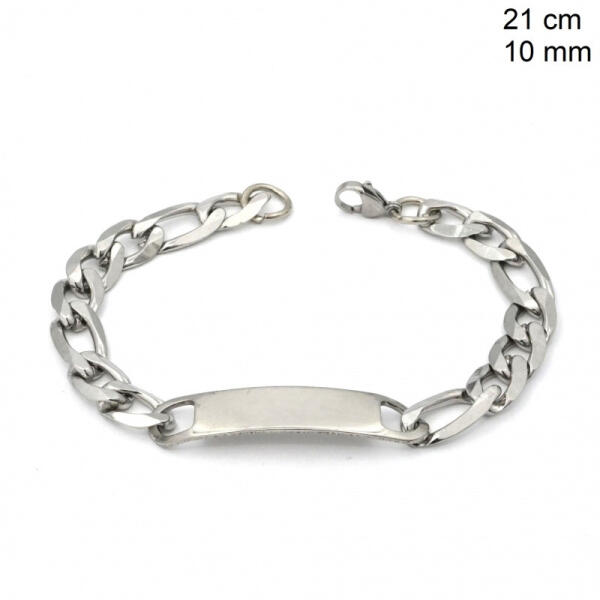 Termék jellemzői: Ezüst színű acél karkötő. Az egyenes felületre gravírozunk, körvonalasan. A gravírozás színe fém színű lesz. Gravírozási technika : Mechanikus (körvonalas) Méret(pánttal és csattal együtt):210x10mm Anyaga : Rozsdamentes acél