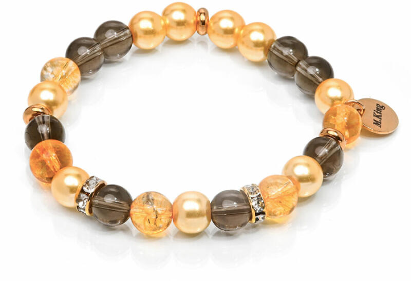 Vagány, mégis kifinomult füstkvarc és citrin ásvány karkötő. Sejtelmes füstszín, aranysárga citrin és különleges aranysárga szintetikus kagyló a tökéletes harmóniáért. Figyelem! A képen exkluzív kivitelű, rugalmas karkötő látható kapocs nélkül, de kérheted extra erős acélsodronyra is delfinkapoccsal és 5 cm hosszabbítólánccal. Ha a kapcsos verziót kéred, ami