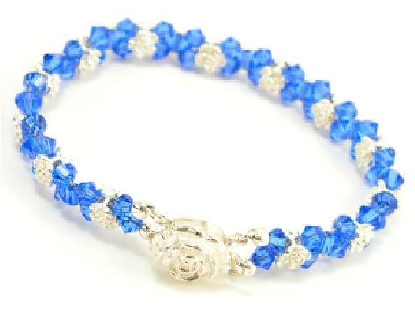 Swarovski kristály gyöngyökből és rózsa mintás speciális ezüst köztesekből füztem ezt a különleges csillogó kristály karkötőt. A karkötő hossza: 18cm gyöngyök mérete: 4mm bicone szín: sapphire A fém részek és a kapocs 925 ezüst.