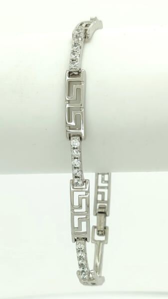 Ezüstszínű karkötő, melyet fehér cirkónia kristályok tesznek csillogóvá és áttört görög minta díszít. A kristályok karmos foglalatban helyezkednek el, a karkötő teljes hosszát díszítik. Időtálló ékszer, nem feketedik víz hatására sem. Mindennapi használatra is tökéletes választás. Antiallergén ékszer. Karkötő szélessége: 5 mm és 2,5 mm. Az antiallergén é
