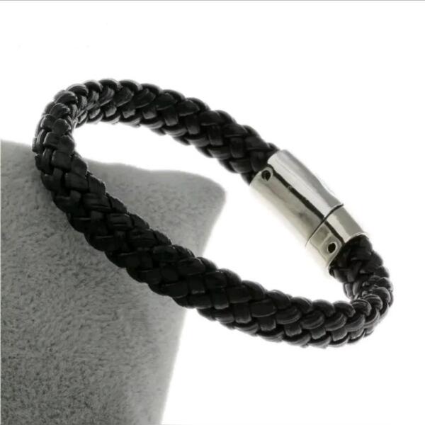 Kapcsos férfi fonott bőr karkötő, mágnes zárral. Mérete fix, 18-19 cm férfi csuklóra illik.