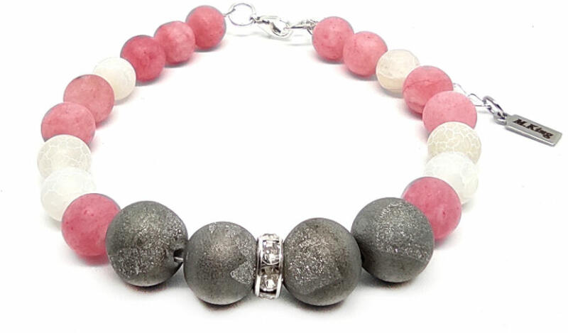 Figyelem! Nem szakad, nem nyúlik! Tartós ékszer. Kérheted csat nélküli rugalmas gumidamilra is. Amennyiben rugalmas damilra kéred, Megjegyzésbe írd be rendeléskor, hogy csat helyett rugalmas gumidamilt kérsz, és a csuklód körbemért méretét is írd meg. Az ékszer ásványai és tartozékai: – 10 mm-es Ezüst DRUZY Achát – 8 mm-es matt rózsa Jade – 8 mm-es roppantott fe