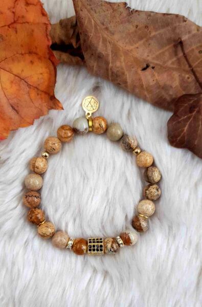 Egyedi tervezésű LUXURY ásványkarkötő képjáspis ásványból aranyszín díszítéssel.