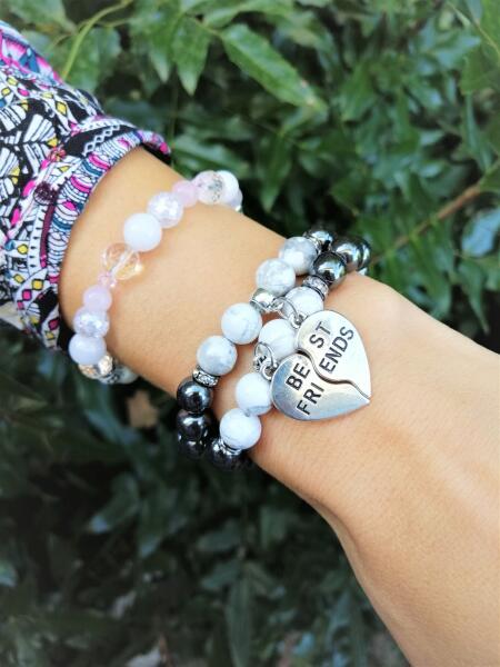 Ez az egyedi karkötőpár, 8 mm hematit és howlit ásványokból készített, két részes félbe tört szív medállal, mely a köteléket jelképezi két barát között. Gyönyörű, tündöklő, egyedi darab, ami biztosan sikert arat.