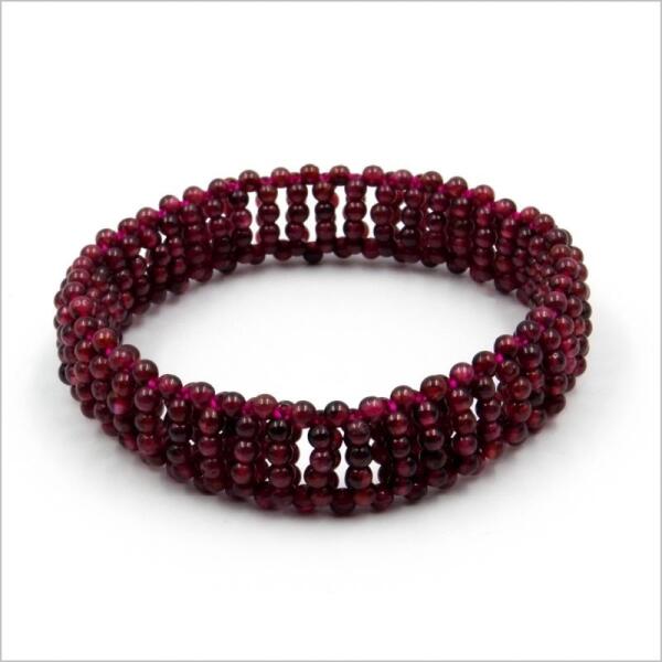 Egyedi fűzött technikával készült természetes gránát ásvány köves rugalmas karkötő. A karkötő szélessége: 12mm hossza: kb 18cm, de könnyen tágul Gránát gyógyhatása