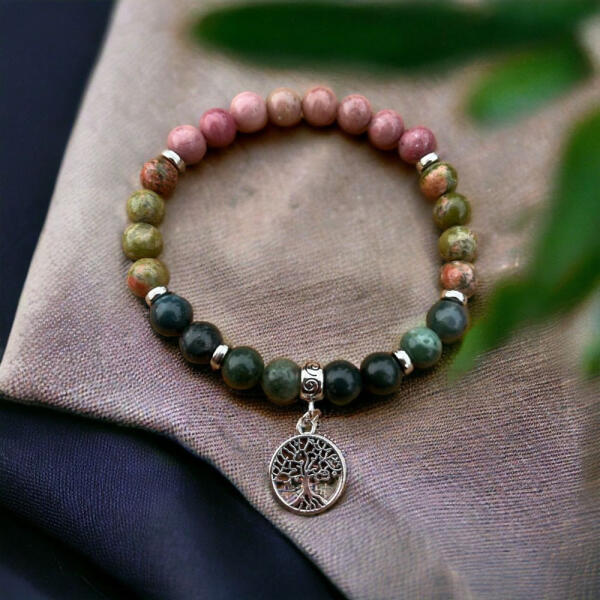 A gyöngyök átmérője: körülbelül 8mm Rodonit tulitból, Unakitból és Mohaachátból készített karkötő, ezüst színű kisebb közökkel és életfa medállal diszítve. Nem tudod, hogyan válassz csuklóméretet? Kattints ide és segítünk! Kizárólag minőségi ásványokból készítve! Ingyenes dísztasakban érkezik hozzád, így akár ajándékozásra is készen áll. 1-3 Munka