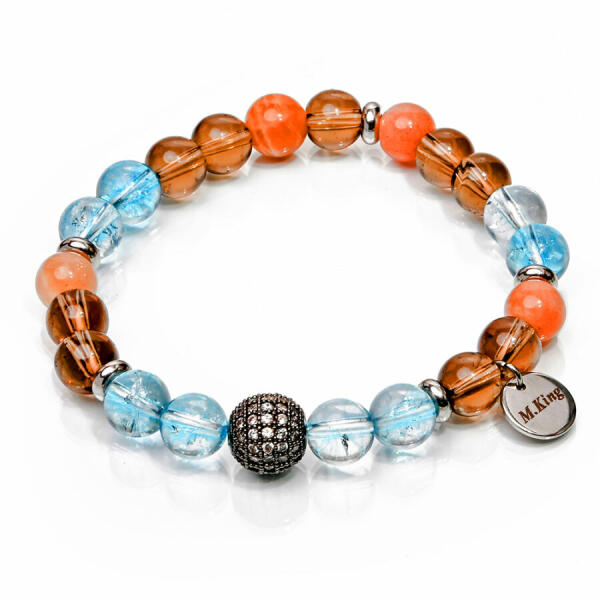 A Föld és a Nap színei jelennek meg ezen az exkluzív tervezésű topáz, füstkvarc és napkő karkötőn, az ég kékje, a Nap aranya és a Föld barnás árnyalata különleges hangulatot áraszt. Figyelem! A képen exkluzív kivitelű, rugalmas karkötő látható kapocs nélkül, de kérheted extra erős acélsodronyra is delfinkapoccsal és 5 cm hosszabbítólánccal. Ha a kapcsos verzió