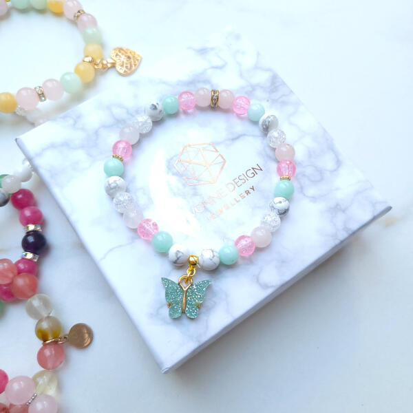Álomszép ásványkarkötő arany-türkiz pillangó medállal, mely gyönyörű 6 mm-es roppantott hegyikristály, howlit, amazonit, rózsakvarc ásványokból készült.