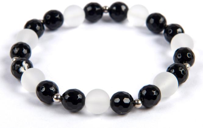 Ez az ásvány karkötő fazettált 8 mm-es ónix és matt hegyikristály gömbökből készült, duplasoros gumira fűzve. Díszítőelem : 2 mm-es antiallergén gömb. A hegyikristály hatása : a hegyikristály a mestergyógyítók közzé tartozik, mert bármilyen betegséget képes gyógytani. Tanulás során segíti a figyelemösszpontosítást. Az érfalakat tisztítja a rajta lévő lerak
