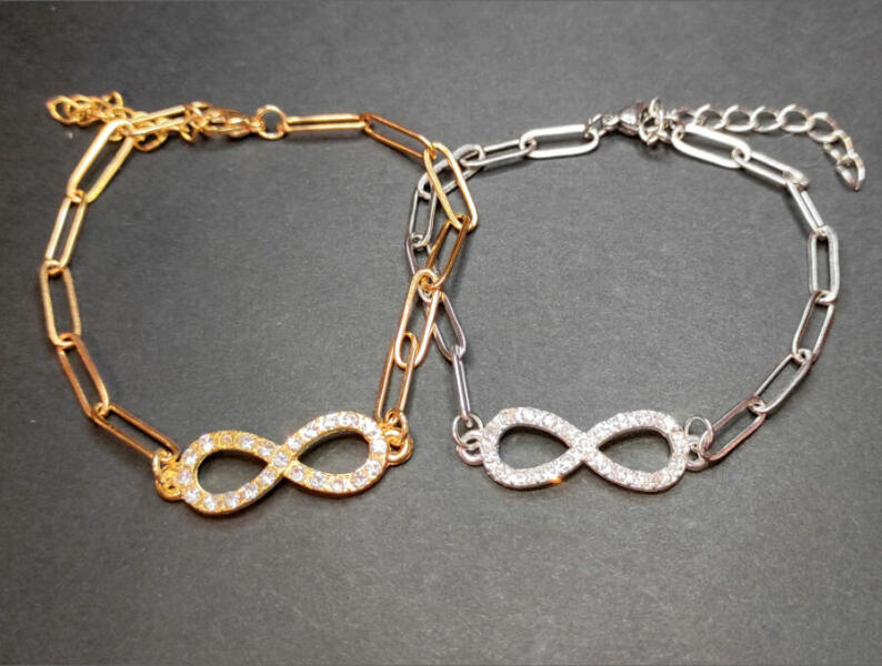 Kristál yos Végtelen charmos karkötő, 2 db. Paraméte rek: Charm mérete 3x1 cm. Anyaga fémötvözet és kristály, karkötők anyaga rozsdamentes acél. Karkötők mérete 17+5 cm. (Ha ettől eltérő méretet szeretnél, rendeléskor a MEGJEGYZÉSBE írd be. )
