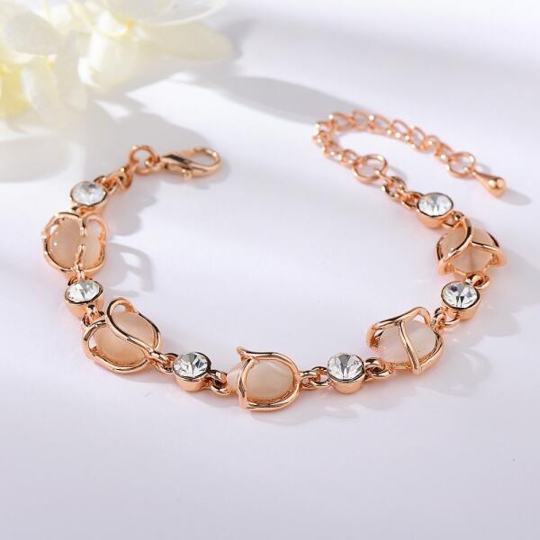 Cikkszám: 0954 Karkötő: - rózsaarany bevonattal, - áttetsző kristályokkal, - fehér opálköves díszítéssel. Hossza: állítható (16 cm + 4 cm). Szélessége: 1 cm. Súlya: 16 g. Alapanyaga: minőségi fémötvözet Gyönyörű, elegáns ékszer ! A megadott méreteket kérjük vegyék figyelembe !