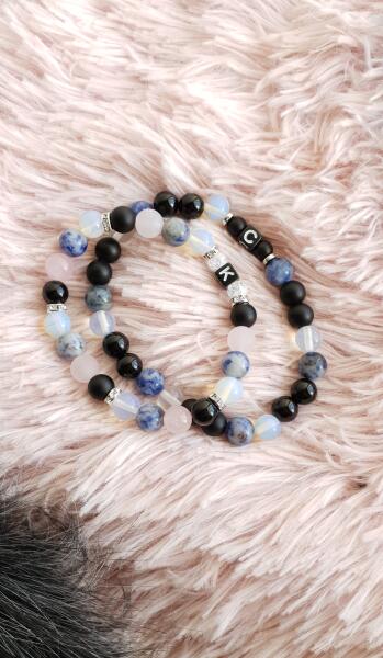 ❤ SZERELEM karkötőpàr betűkkel ❤ Ebben a karkötőpárban minden benne van, ami erősíti a kapcsolatot, a szeretetet, az összetartozást és közben segít a nyugodt, kiegyensúlyozott párkapcsolat fenntartásában! Ónix - Védelmező kő, a negatív hatások ellen Holdkő - Szabadjára engedi a vágyakat, fantáziákat Szodalit - Nyugalom, béke, kiegyensúlyozottság Rózsakvarc - Sz