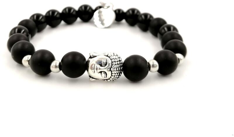 Gyönyörű egyedi LUXURY fekete ónix ásványkarkötő ezüst szín buddha medállal.