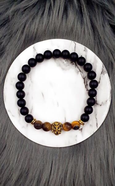 Ez egy gyönyörű egyedi tervezésű 8 mm átmérőjű matt barna tigrisszem és matt fekete ónix ásványokból készült férfi karkötő, mely egy arany szín oroszlánfejet tartalmaz.
