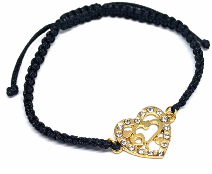 Arany színű kristályos Szív díszes karkötő, fekete makraméval. Paraméterek: Charm mérete 2,6x2 cm. Anyaga fémötvözet és kristály, karkötő anyaga szövet, mérete állítható. Romantikus, letisztult ékszer, kristályos szív medál egyszerű karkötővel, mégis, ez a legkülönlegesebb ajándék.