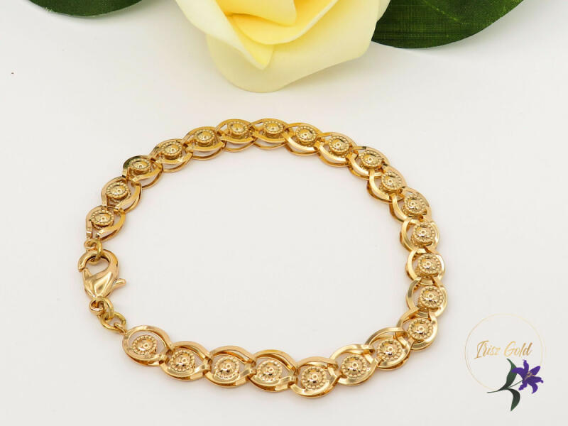 Antiallergén gyönyörű pávaszemes karkötő Szin: 18K Méret:21 cm / 7mm Zár: delfin kapoccsal záródik A forgalmazott divatékszerek alapanyaga nikkel és ólommentes ezért többnyire nem okoznak allergiás tüneteket, nyugodtan hordhatják fémérzékeny emberek is. Általában nem színezik a bőrt és más divatékszerekhez képest nagyságrendekkel jobb kopásállósággal rendelkeznek